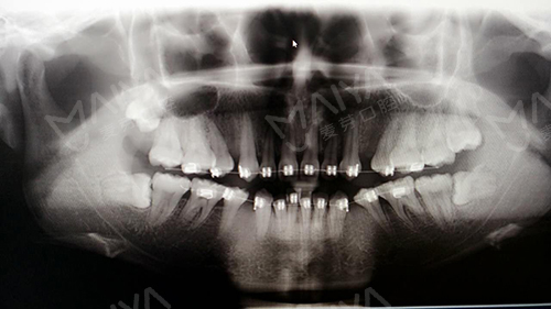 经过口腔全景片检查,张超主任全面分析认为何小姐可继续使用托槽矫正,不拆卸,同时为何小姐量身制定了分阶段的矫正方案,第一步减轻压力,让牙齿慢慢恢复正常状态;第二步细丝轻力让牙齿缓慢移动让骨改建再平衡,第三步排列牙齿内收关闭拔牙间隙,改善牙齿前突,此方案在既不改善脸型的同时又减轻了痛苦。