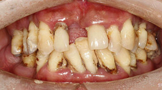 “蛀牙啊,就是十年前第一颗蛀牙的时候不敢去看医生,然后就一直放着,之后引起牙周炎疾病,造成传染性的整口牙周病,导致牙龈萎缩,牙槽骨吸收,牙根暴露,满口牙就都坏了。”