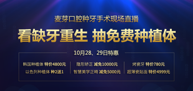 本次“种植牙手术直播”特别适合单颗多颗牙缺失、全口或半口牙缺失、牙齿松动、活动假牙不适、活动牙修复失败、烤瓷牙失败等人群观看。此外,在活动现场,麦芽口腔还为朋友们设置丰富且极具诱惑力的奖品,除了精美的随手礼、缴费礼之外,以色列 MIS 种植体种 2 送 1,Nobel 系列种植体减免2800元,韩国种植体特价4800元,心动了吗?更为心跳的是还可以抽取价值12000元种植体!如果您正在犹豫着要不要种牙,那就不要错过这次盛会了,毕竟缺牙问题总是要解决的,长时间不处理会危害健康,而且能够零距离了解种植牙的机会不多!力度这么大的优惠也不常有!