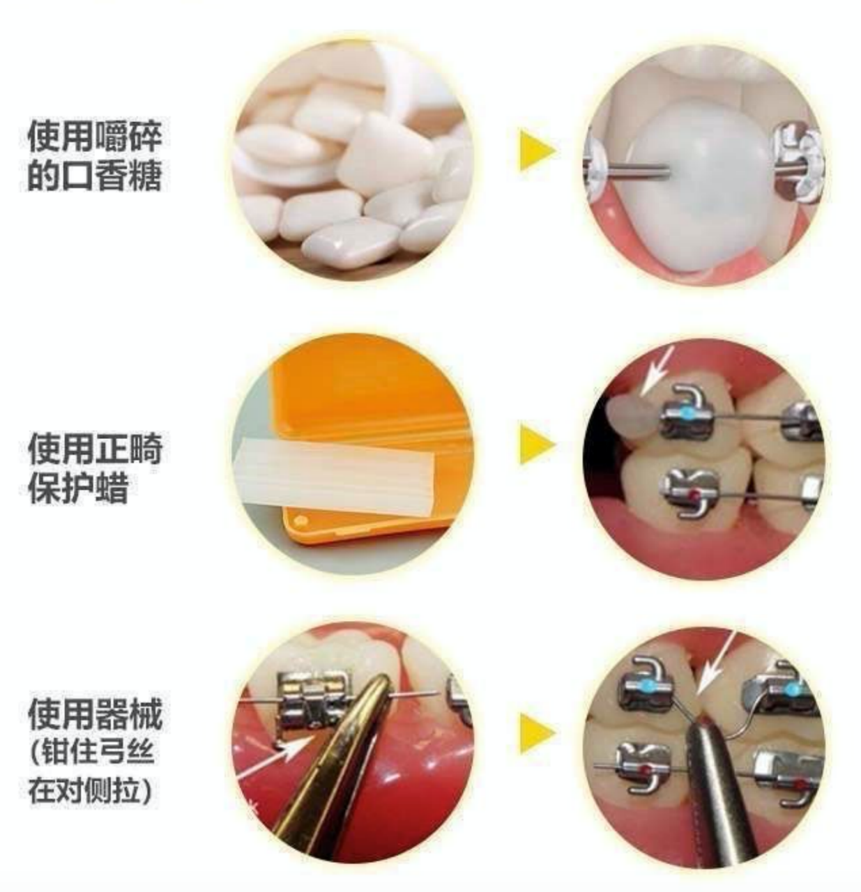 第三、针对末端过长的弓丝,可以用正畸保护蜡封住,以免刮伤口腔粘膜;
