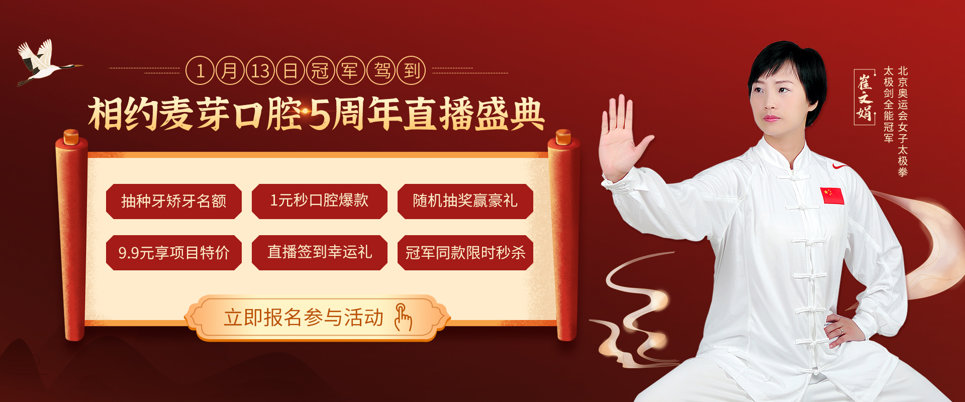 就在1月13号奥运冠军将会亲临直播现场,带来冠军福利如:随机抽奖、问答抽奖、秒杀抽奖等等等众多大礼。现场奥运冠军会与直播间的朋友们畅谈冠军经历,送冠军福利,大家有没有很期待?